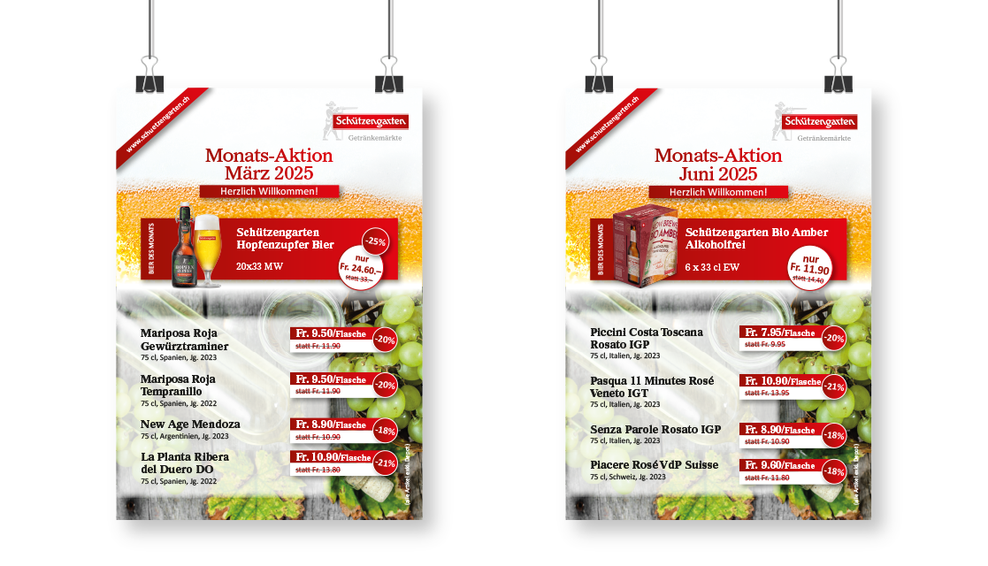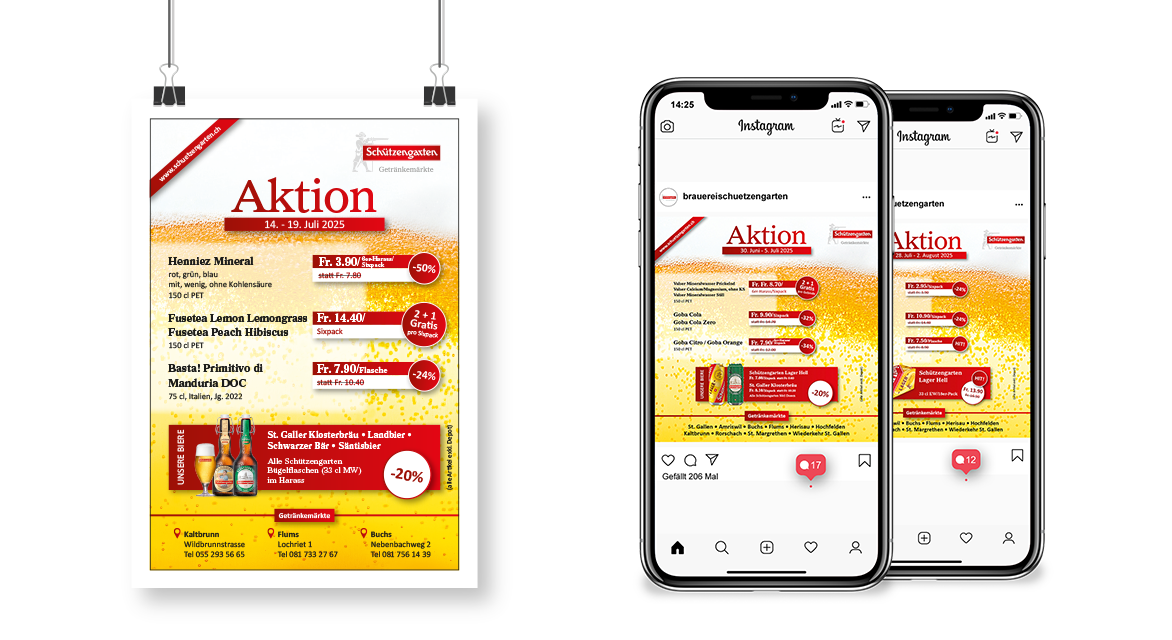 Um weitreichend auf ihre Wochenaktionen aufmerksam zu machen, unterstützen wir die Brauerei Schützengarten bei der Erstellung der benötigten Werbemittel. Sowohl die Bilder für die Website als auch die Postings für die Social-Media-Kanäle werden, in enger Absprache mit dem Kunden, von unserer hauseigenen Grafik aufbereitet. So garantieren wir eine optimale Qualität des Contents für die entsprechenden Kanäle.